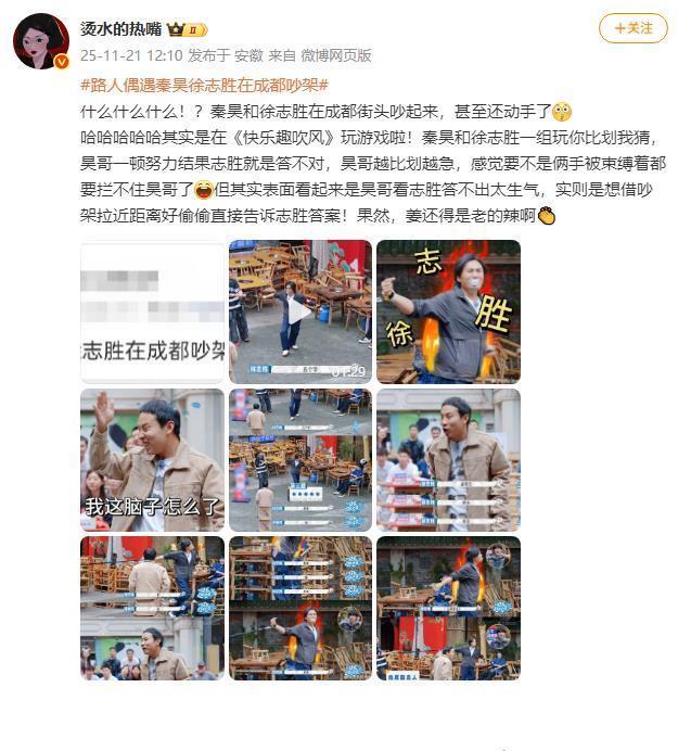 路人镜头里,秦昊双手被绑嘴叼奶嘴,急得直跺脚; 徐志胜则一脸懵圈地抓着对方胳膊,两人你来我往的样子让围观群众都捏了把汗。 评论区瞬间炸开锅——这已经是《快乐趣吹风》本周第三次因为嘉宾“冲突”上热搜了。 其实熟悉这档节目的观众早就见怪不怪。
